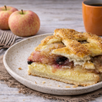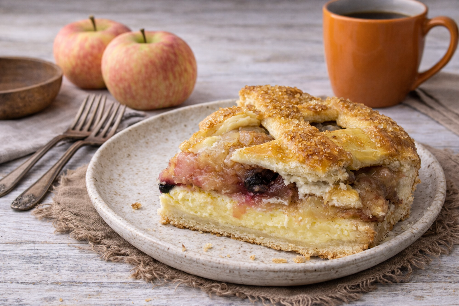 A moist & creamy custard layered pie with some juicy baked apples & blueberries topped with a lattice crust.