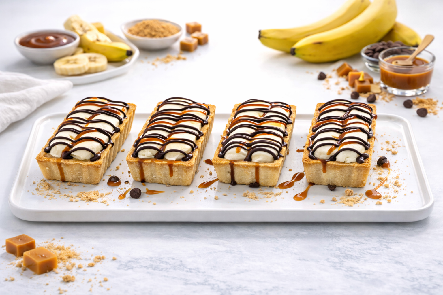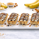 - Vanilla pastry tart filled with banana mousse and topped with cream, caramel, chocolate and banana chips.