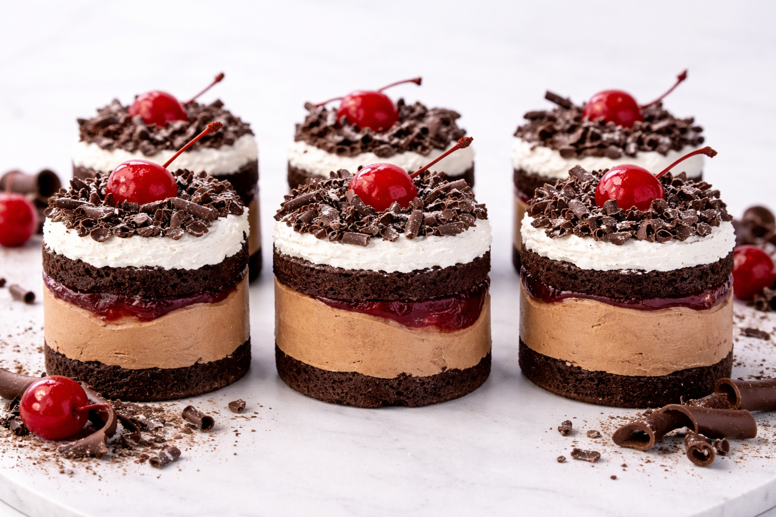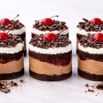 - Layers of chocolate cake, ganache & cream topped with chocolate curls & a glacé cherry.