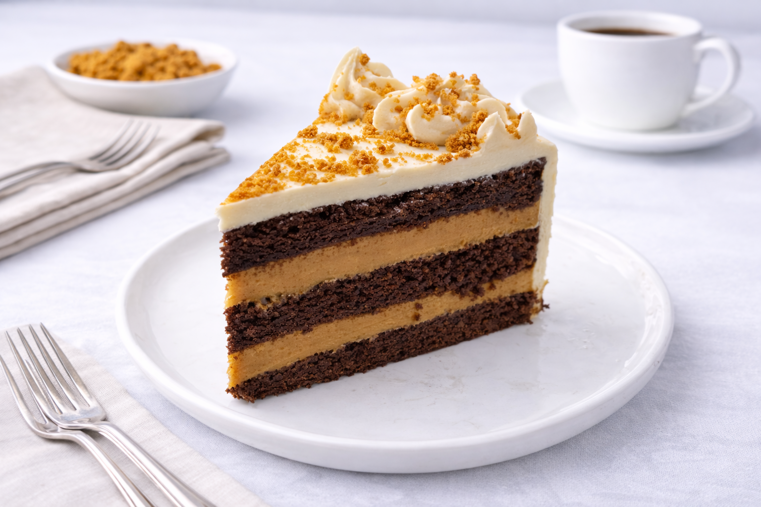 - A chocolate cake with layers of Biscoff ganache topped with some Biscoff biscuit crumbs.