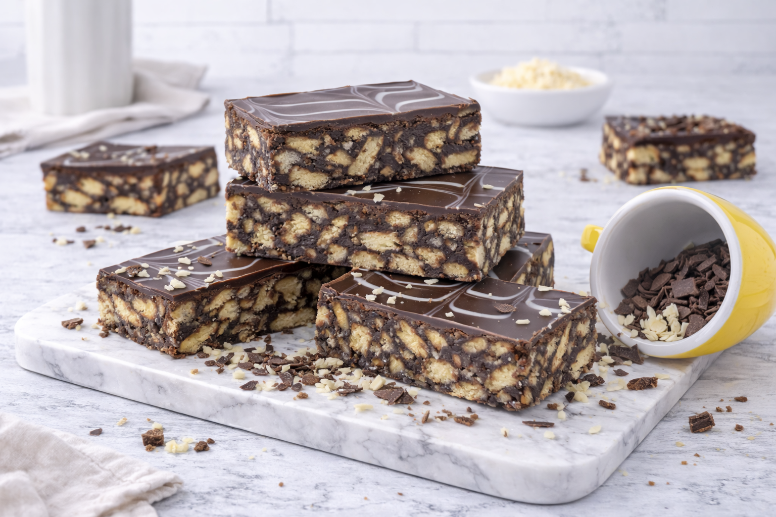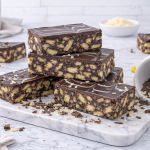 A chocolatey slice made from coconut & biscuit chunks topped with chocolate ganache.