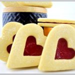 Medium sized jam filled shortbread delights with a heart shaped cut out revealing a smooth raspberry filling.
