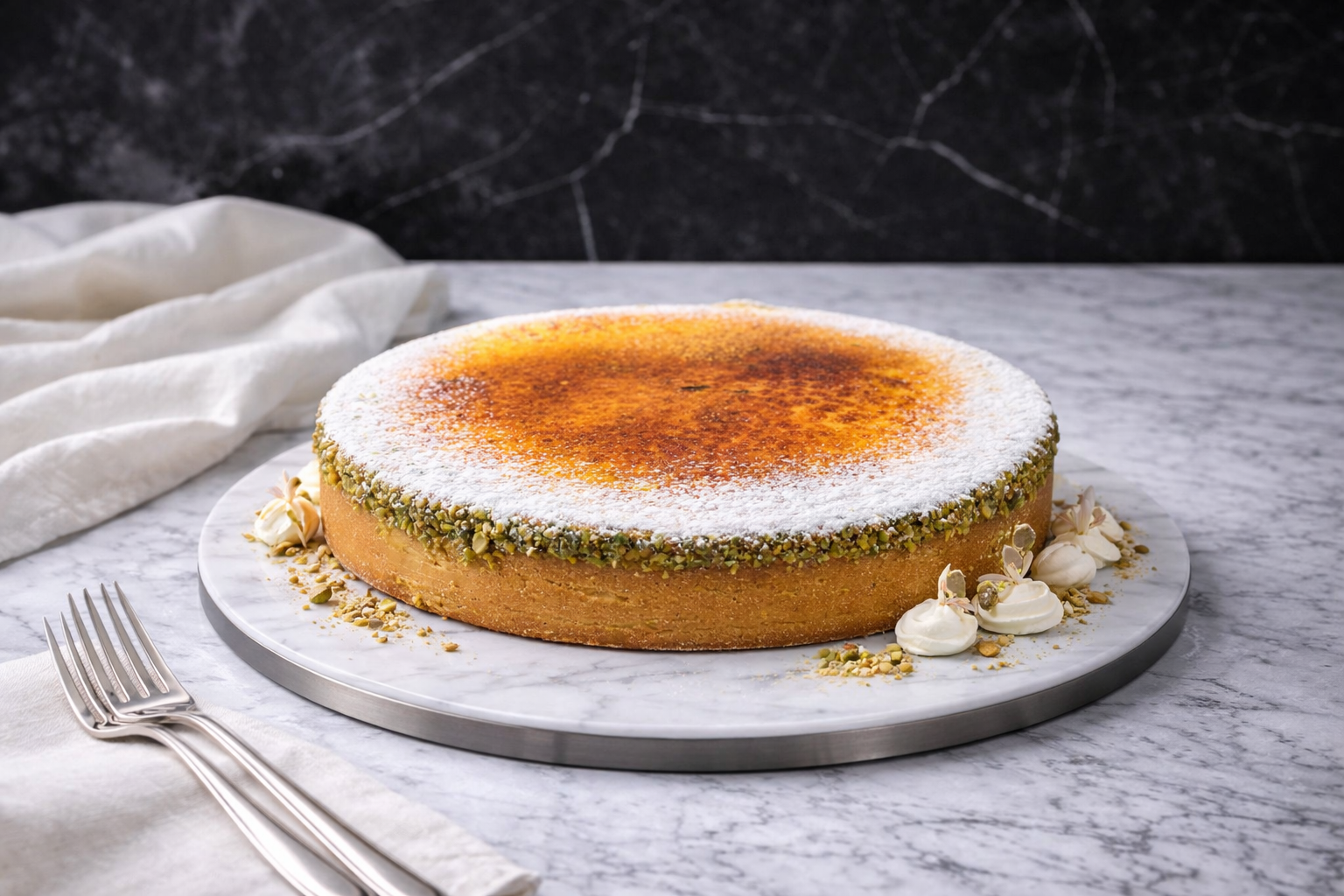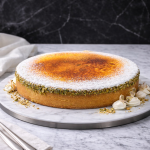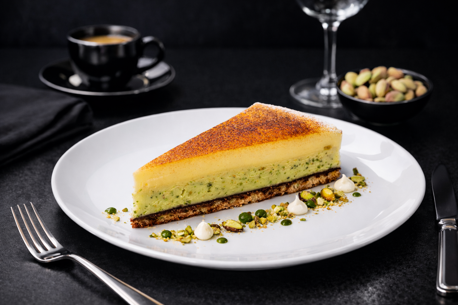 - Smooth vanilla pastry tart with orange curd & pistachio filling topped with a crust of caramelised sugar & pistachios.