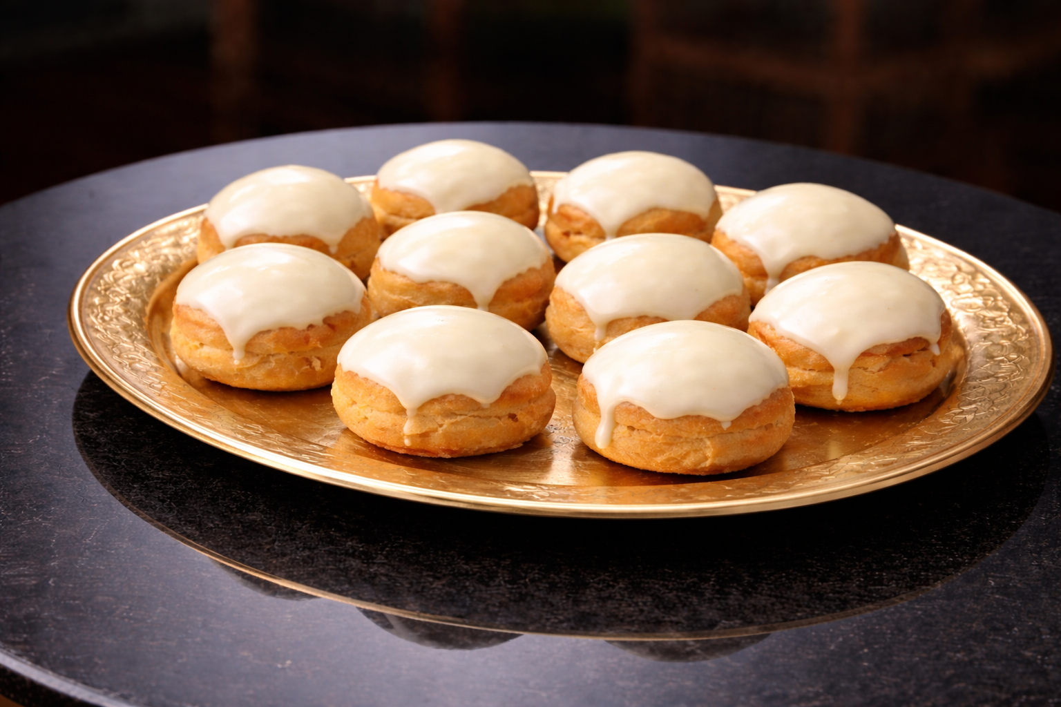 - Traditional choux pastry filled with fresh patisserie cream dipped in white chocolate.