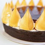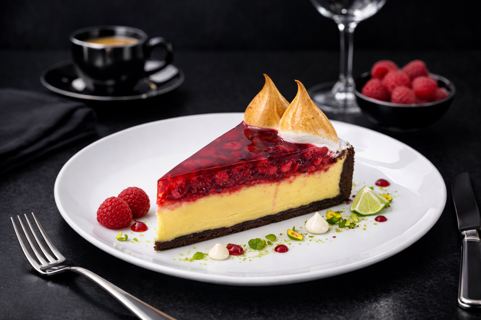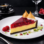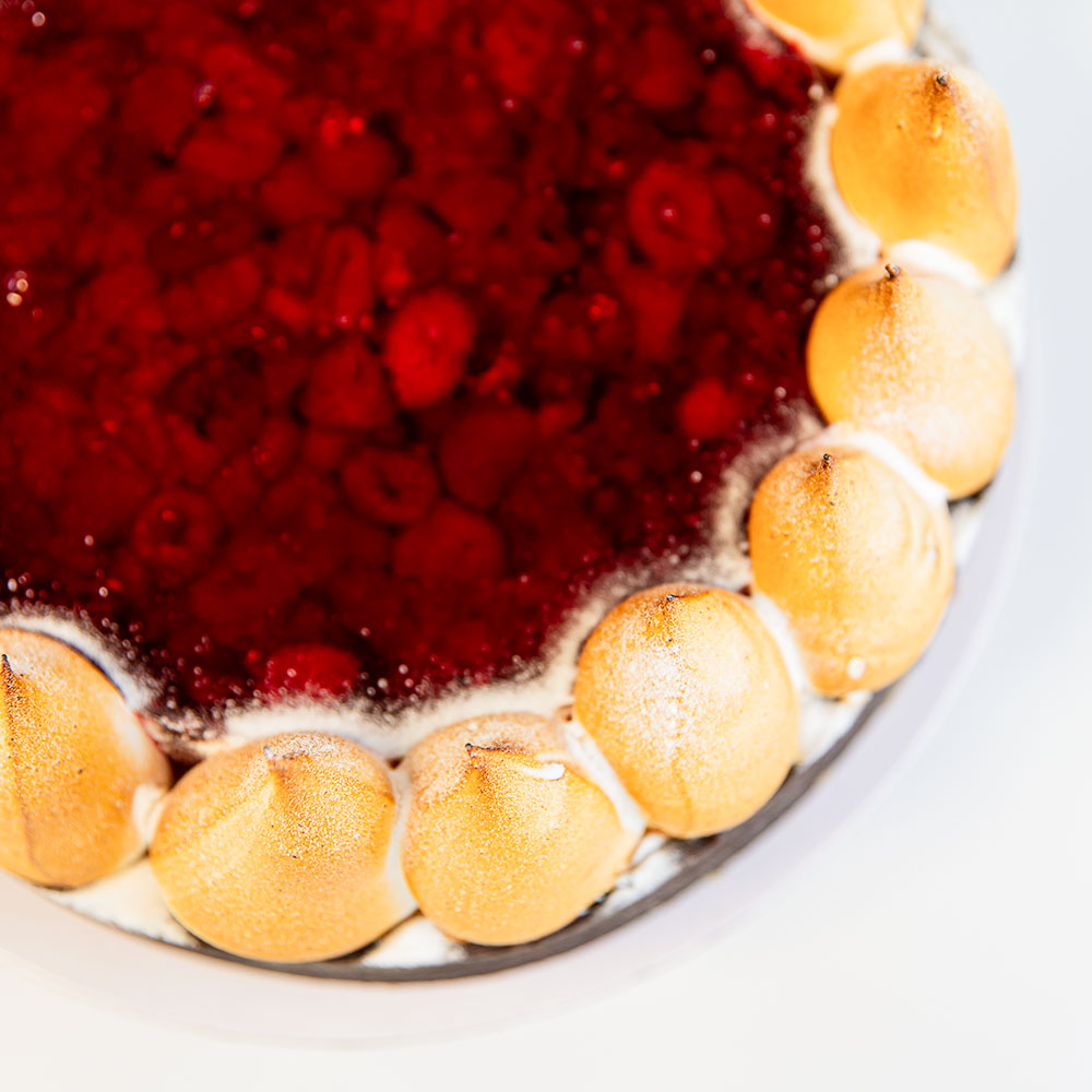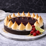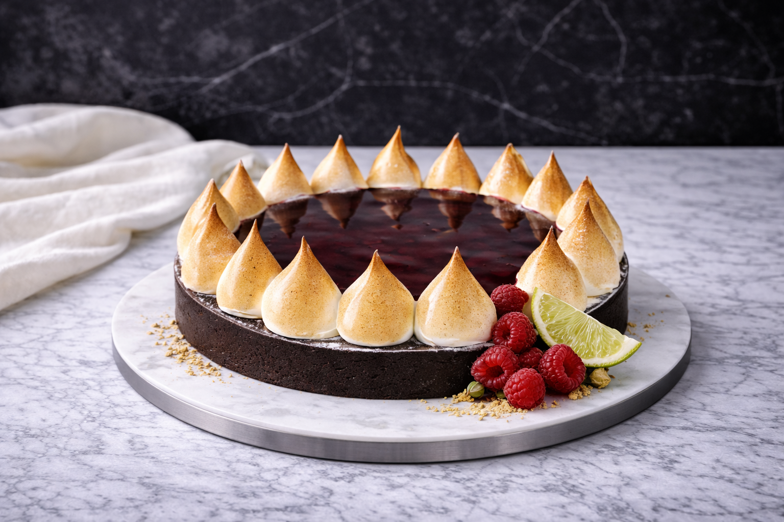 - Chocolate pastry tart filled with lime curd & topped with a raspberry glaze & peaks of torched Italian meringue.